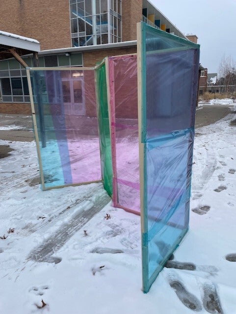 My final project of the semester was titled Perception. The goal of this installation was to be interactive with the community in some way or another. Since the beginning of the course, I had been wanting to do a large scaled yet simplistic installation. I thought that this community-based one would be the perfect one to do that since I could used the observance and perspectives of the audience as the interactive aspect. The concept of Perception was for people to be able to peer through the different colored panels to the environment around them in order to see it in a different way. The message is that changing the lenses we see things through determines how we perceive the world around us.
